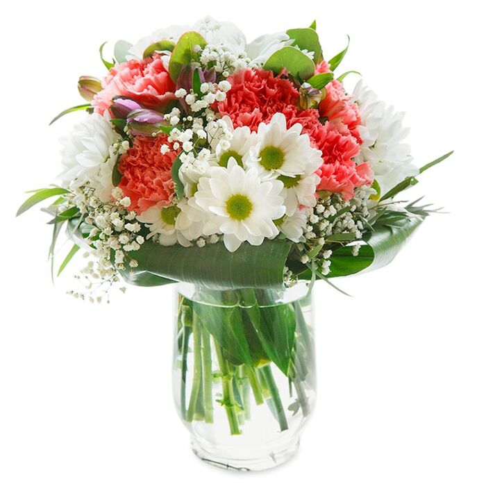 Let your senses be enchanted by our opulent floral creation. This refined bouquet features a symphony of snow-white chrysanthemums, airy gypsophila, and gentle light pink carnations, interwoven with deep green aspidistra leaves. Each element is hand-selected to ensure superior freshness, creating a harmonious piece that is both visually striking and enduringly elegant.